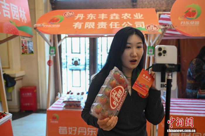 图为年夜会现场商家现场曲播推介草莓。中新社记者 于陆地 摄